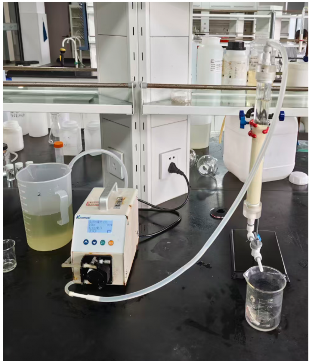 1、取60mlD315OH型树脂装入有机玻璃交换柱内,用除盐水淋洗至出水澄清。