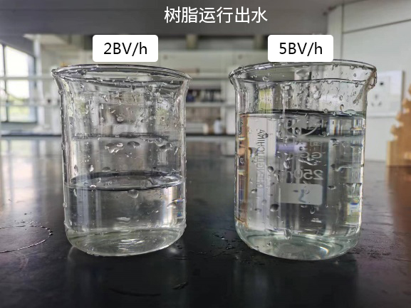 2、将废水从上向下通过树脂层运行,运行流速分别2BV/h和5BV/h,每小时取流出液,检测pH和甲苯,记录试验数据。