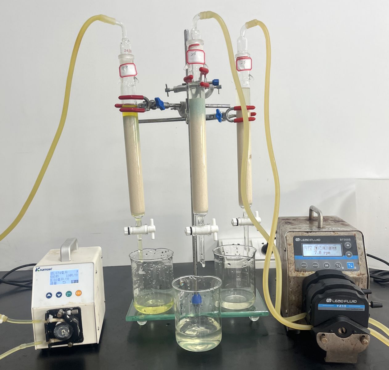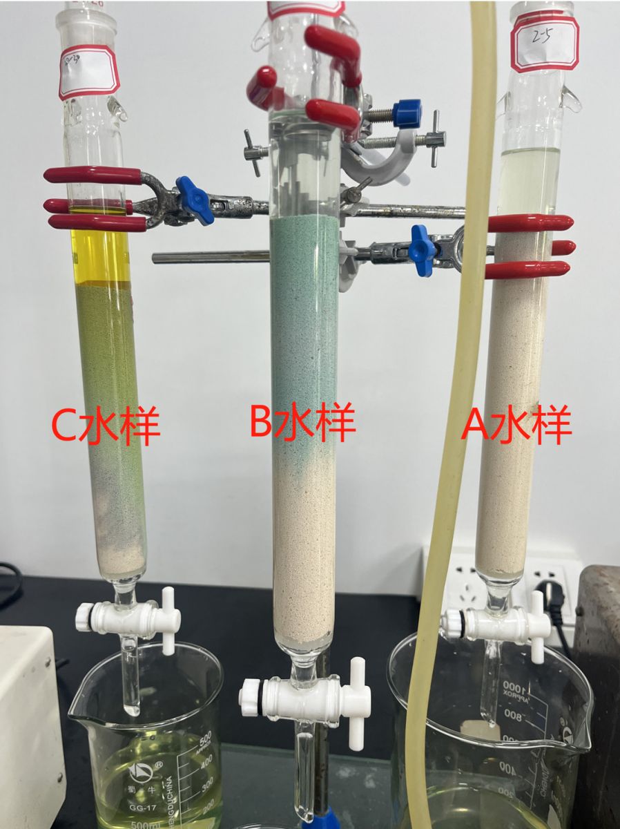 将A、B、C水样分别通过D851运行,树脂柱出现了不同现象,通入A水样后树脂柱无明显变化,B水样和C水样通入后树脂柱出现了明显色带。