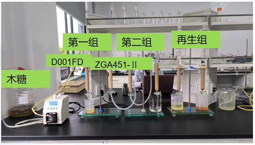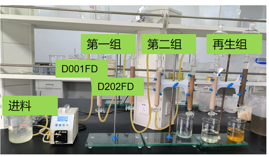 2、二级运行方案:D001FD→D202FD→D001FD→D202FD串联运行,每柱装填量为60ml,运行流速2BV/h,每小时取样检测电导率、PH、透光率并量取出料的体积,做好详细记录并将出料收集在一起。