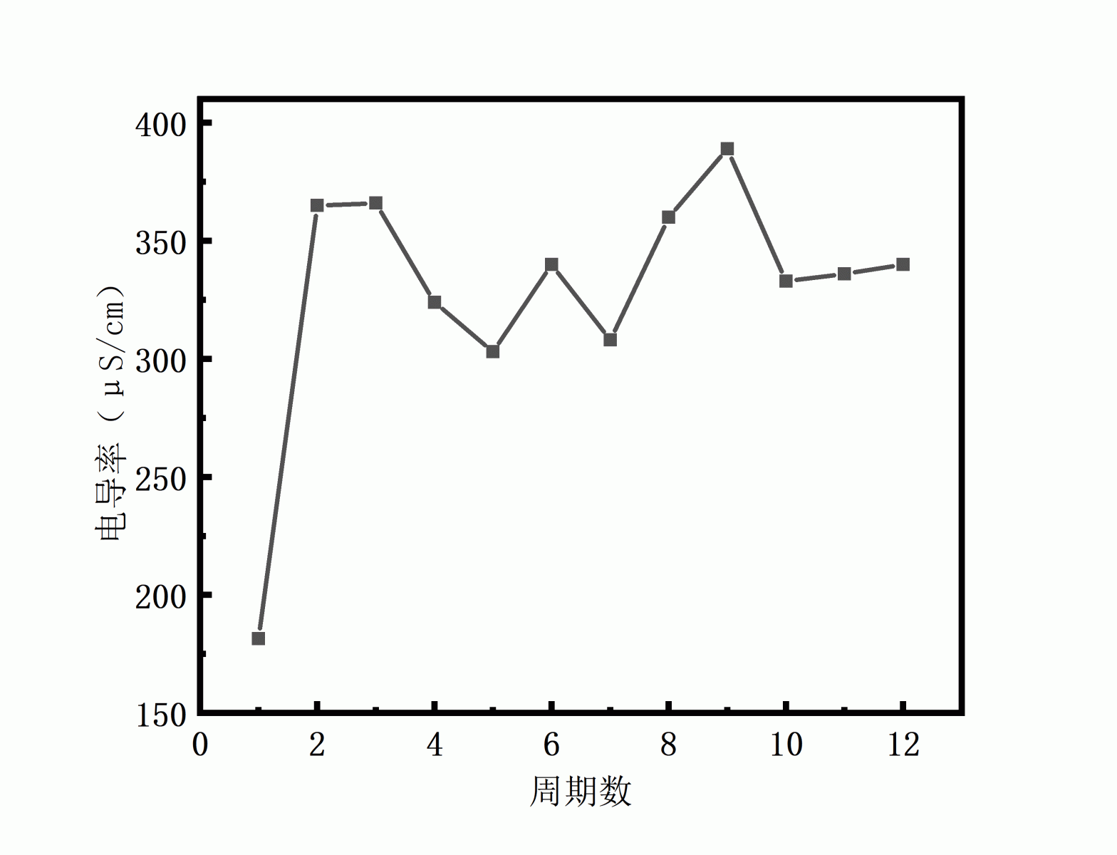 2、电导率随着处理倍量的增加呈现先降后升的趋势,pH随着处理倍量的增加呈现下降趋势,试验中断或过夜放置后会导致电导率和pH值突然上升。透光率呈现逐渐下降趋势,基本在80%~100%。