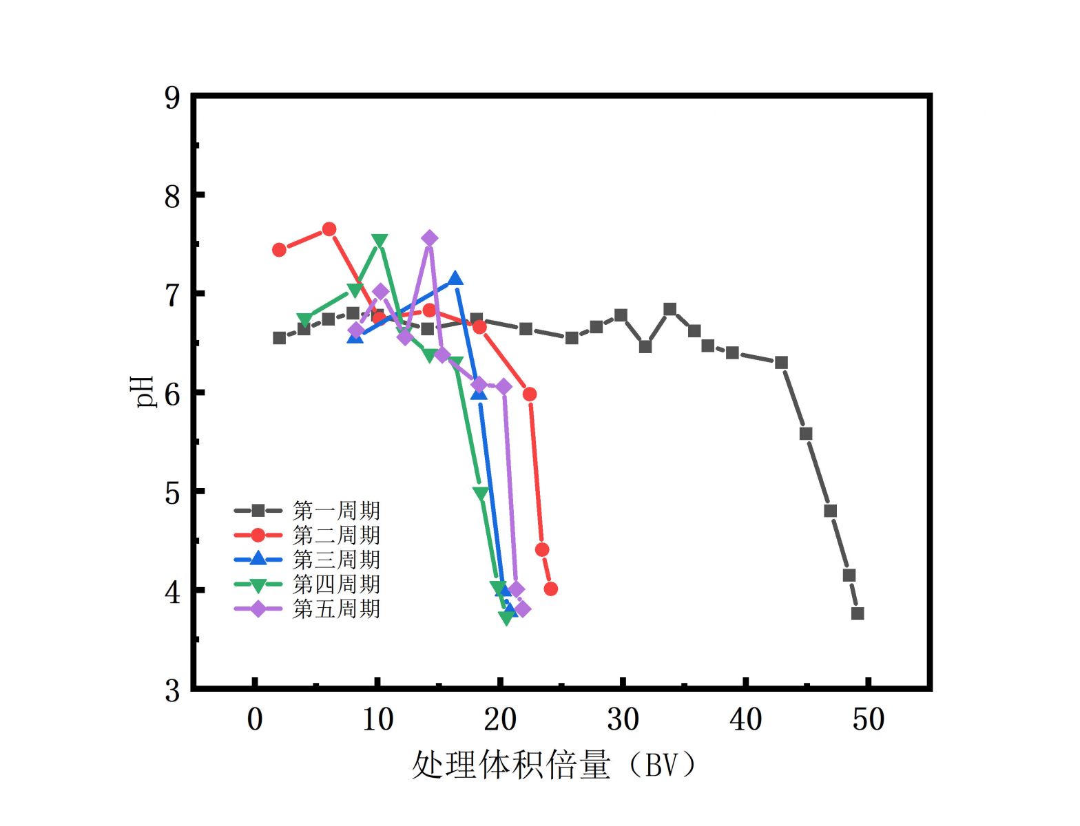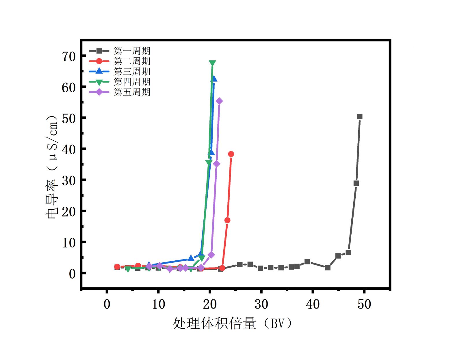 连续运行了5个周期,处理体积倍量在20~49BV。从试验数据看,随着处理体积倍量的增加,电导率先降后升,pH不断下降呈现酸性,透光率逐渐下降,基本在80%~100%。当试验停止一段时间再运行时,会使得电导率和pH值突然增大,这是由于浸出物增多导致的。