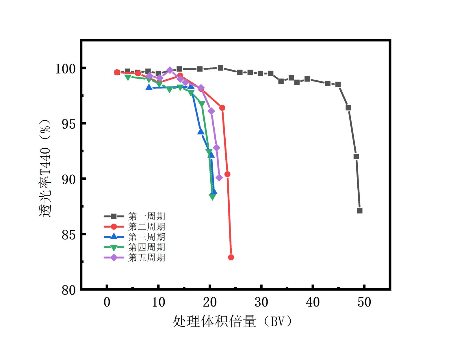 1、从试验数据分析:第一周期运行出料>40BV,主要是一、二级树脂为新再生后的运行模式,连续运行再生后可以稳定在20BV左右。且出料电导率<50µS/cm的情况下,出料透光率基本>90%。