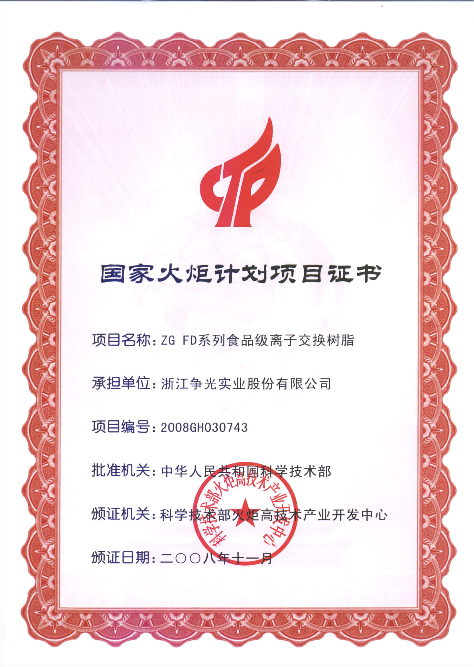 ◆ 2008年11月,ZG FD 系列食品级树脂项目被认定为“国家火炬计划项目”。