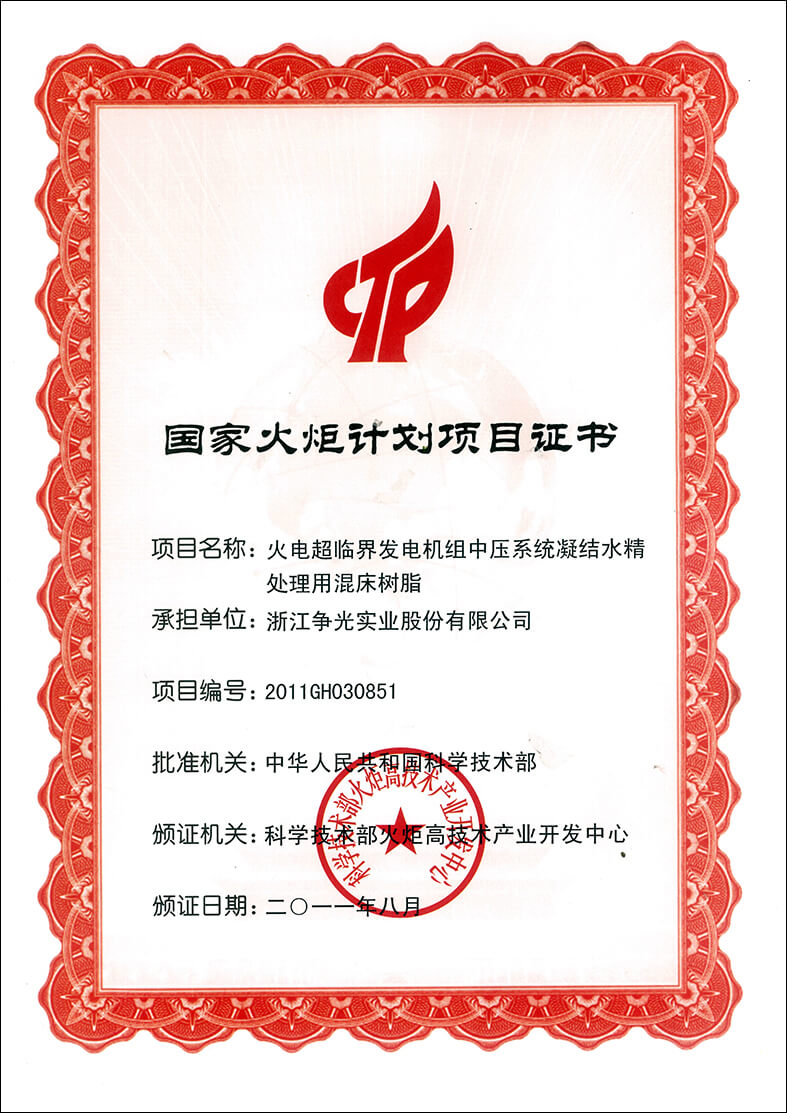 ◆ 2011年8月,火电超临界发电机组中压系统凝结水经处理用混床树脂项目被认定为“国家火炬计划项目”。