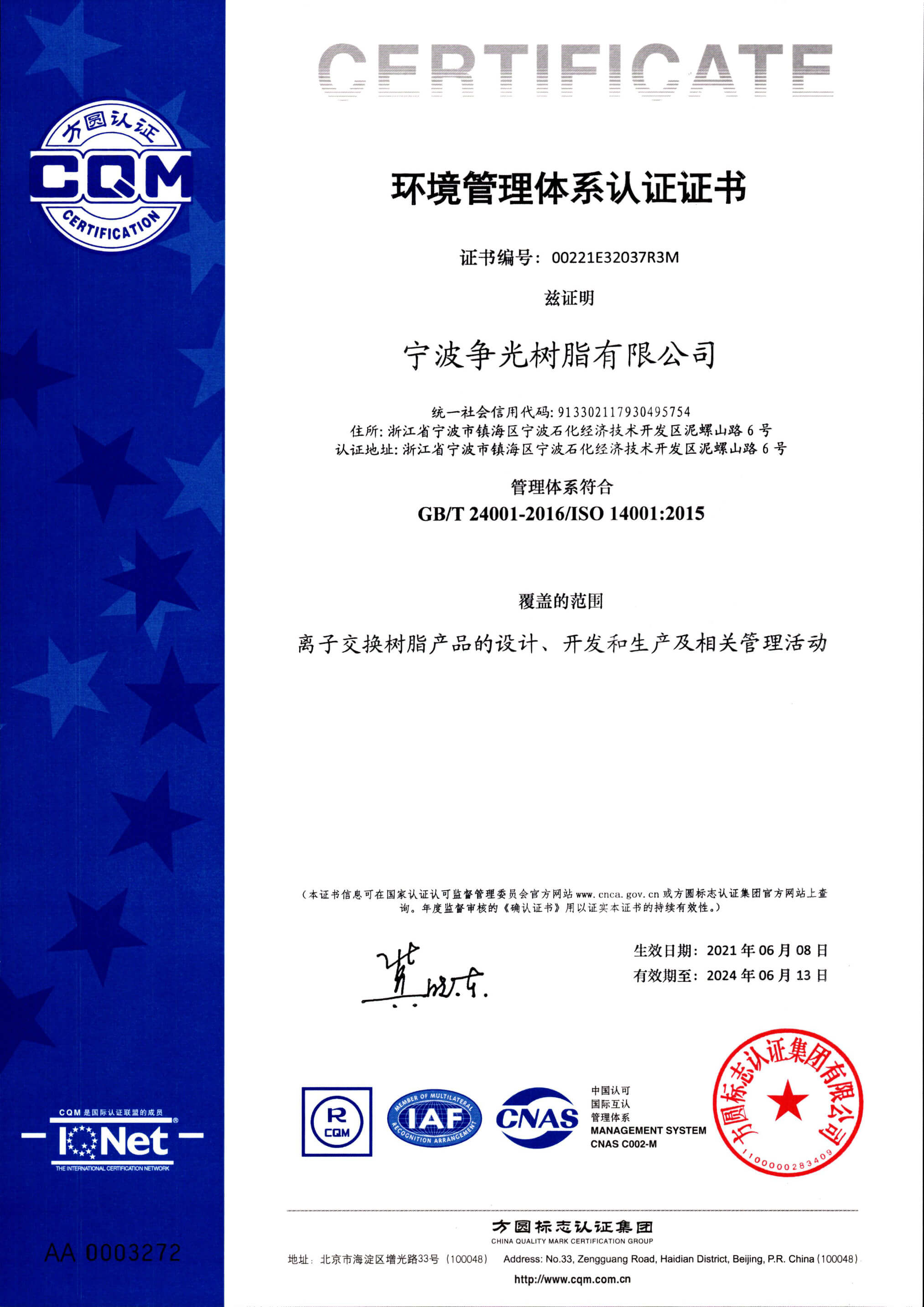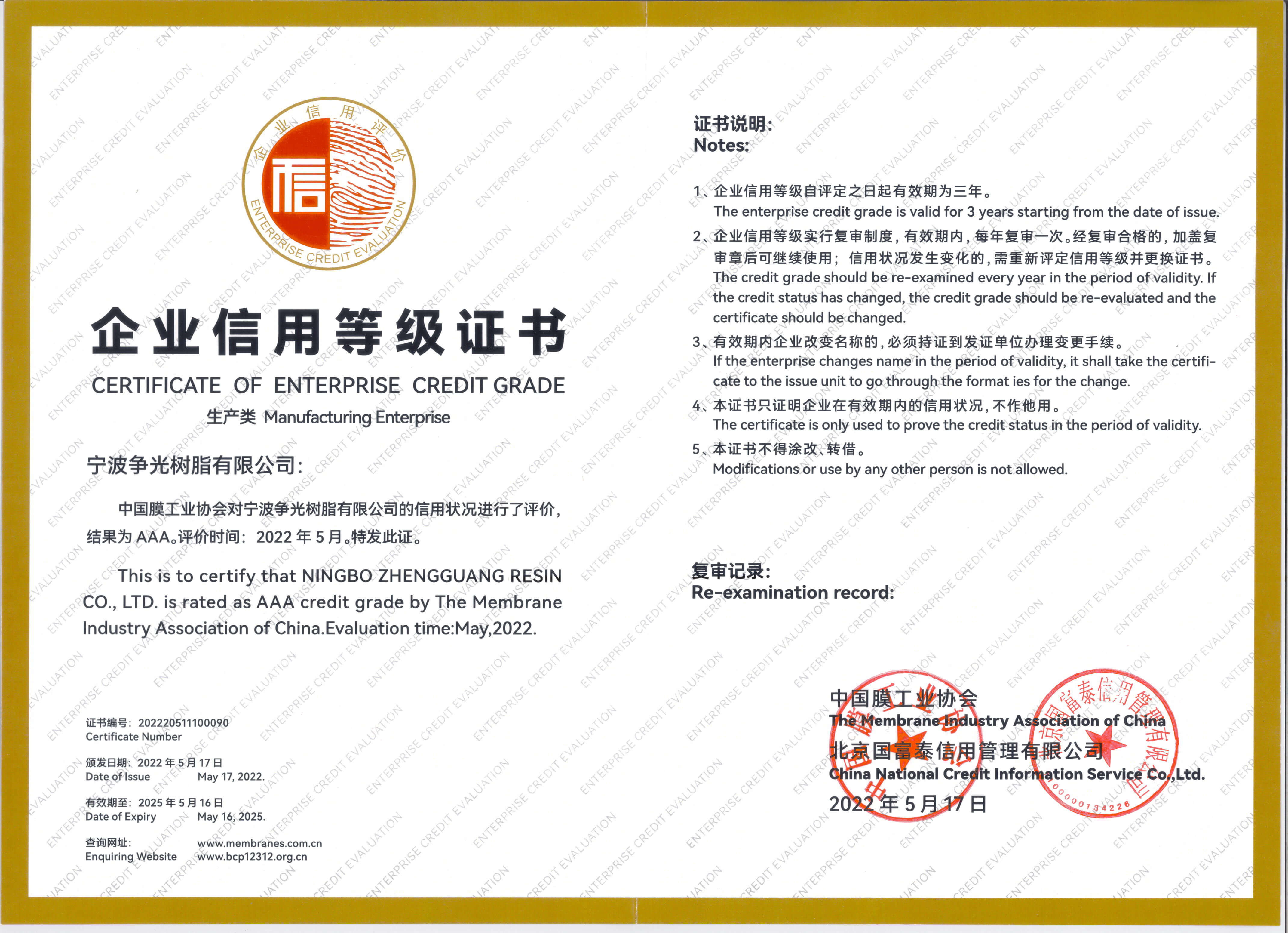 ◆ 2022年5月,子公司宁波争光树脂有限公司被中国膜工业协会认定为企业信用等级AAA级企业。