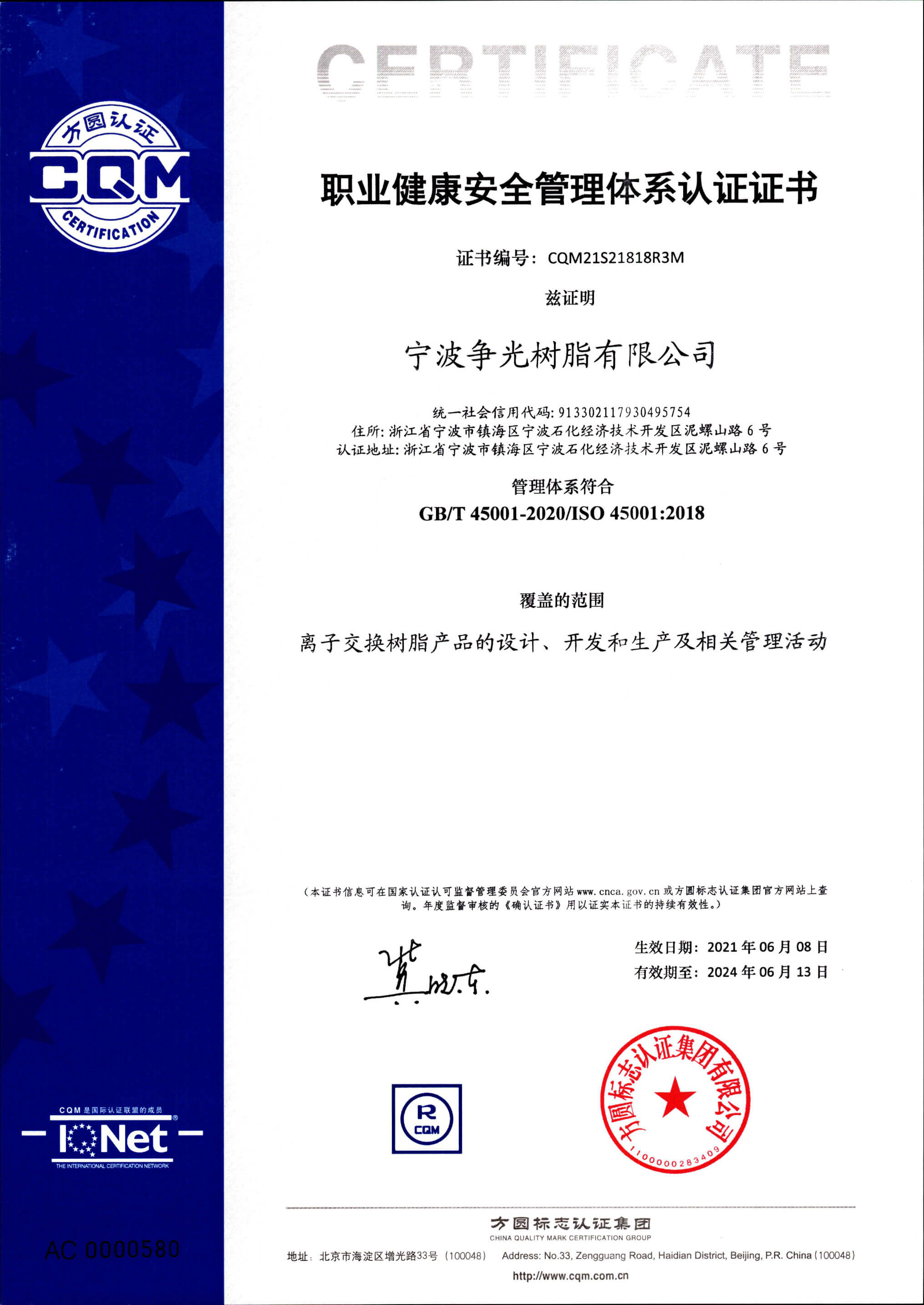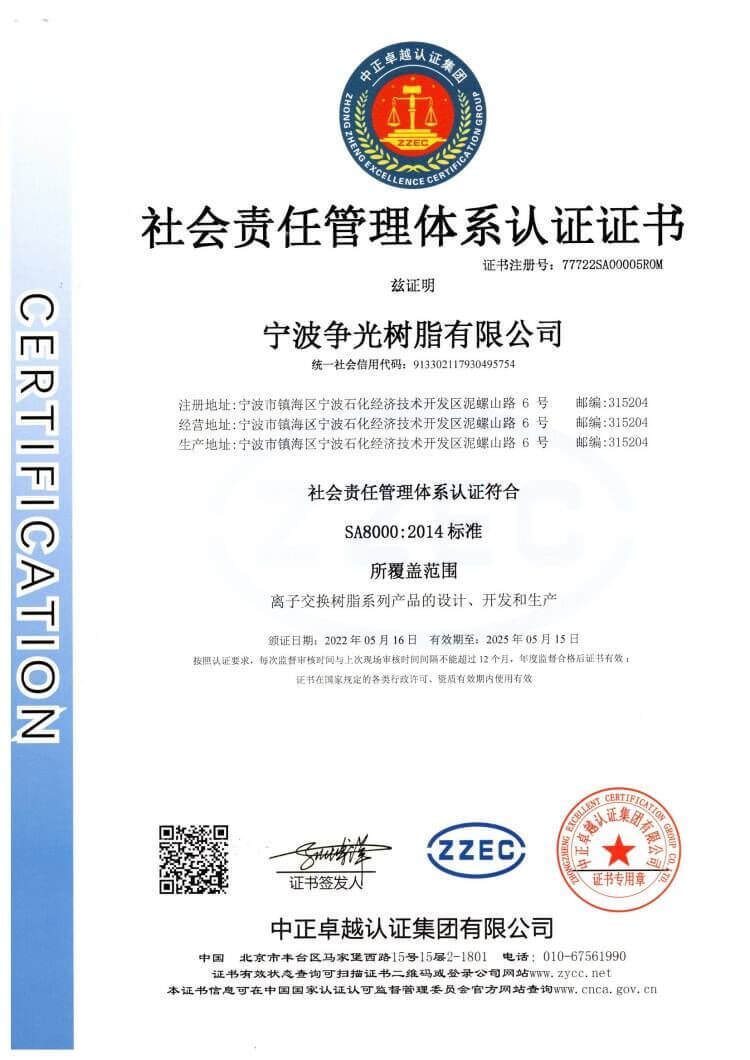 ◆ 2005年9月,“争光”牌离子交换树脂被认定为“浙江省名牌产品”。