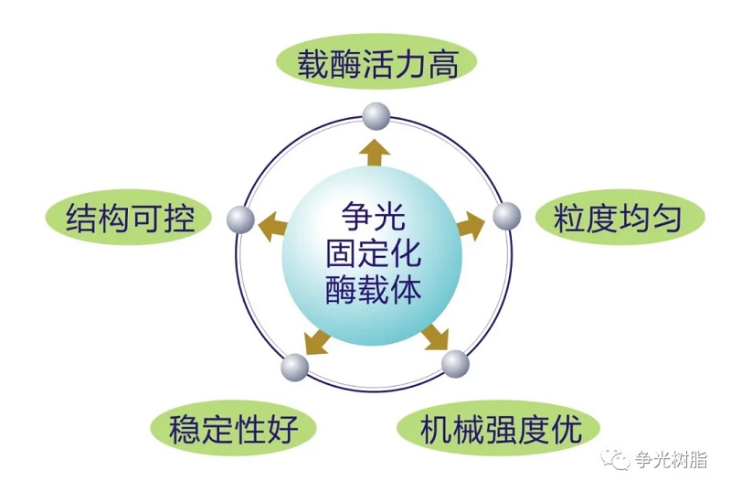 浙江争光现有多种骨架、孔结构和结合基团的类型较为齐全的系列固定化酶载体,固定化酶载体分环氧、羟基、氨基、疏水、吸附和亲和六大类,浙江争光提供的产品具有粒度均匀、结构可控、载酶活力高、批次稳定性好、机械强度优等特点,可固载多种生物酶,以满足不同行业领域、不同使用环境下的生产应用和科学研究等的固定化需求。